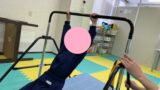 鉄棒にぶら下がり、下に置いてあるやわらかいブロックを
