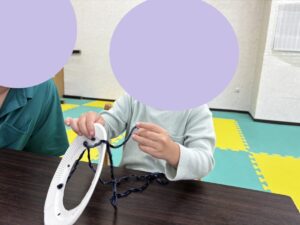 クモの巣に見立てて穴に紐を通したり、