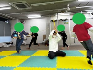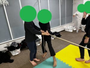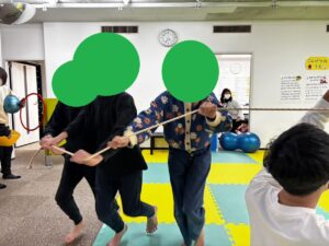 自由遊びの時間に始まった長縄跳びでの遊びですが、みんなで縄につかまりながら走るメリーゴーラウンドから綱引き、バランスボールに結んで馬の手綱のようにしたり等、様々な遊びに発展して楽しんでいました。