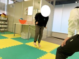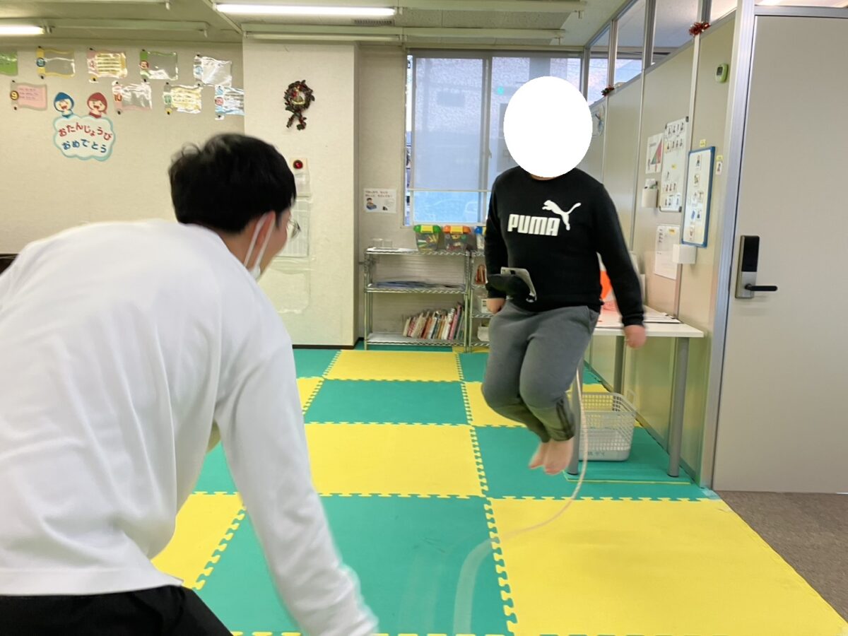 運動遊びの一つにしりとり大縄跳びを行なっています。