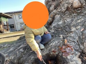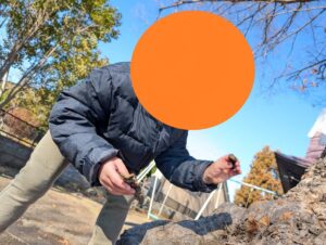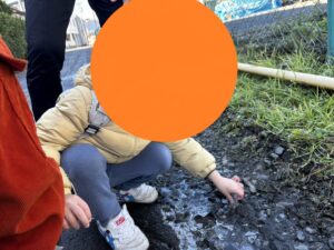 氷があることを伝えると木の枝で突っついてみたり、手で触ってみたりと冬の訪れを楽しむお友だち。触った後は「手がつめた~い」と言いつつも楽しんでいました。
