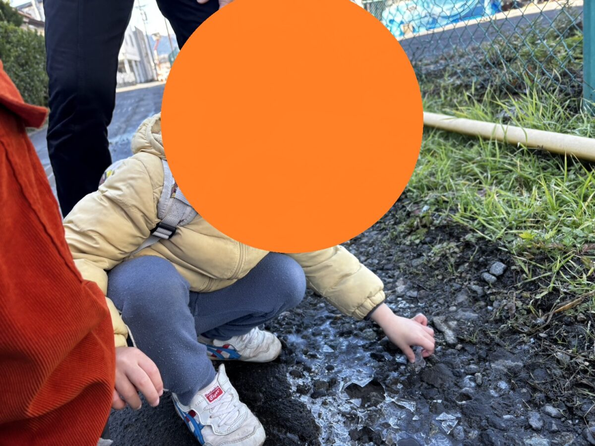 今日はお日様が当たっているところは暖かく、上着を脱いで遊ぶお友だちもいましたが日陰の水たまりには氷がはっていました。