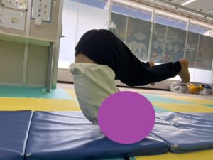 前転は2回続けてですが手の位置と頭の後頭部を付く位置が定まるとお友達は上手に転がっていきました。