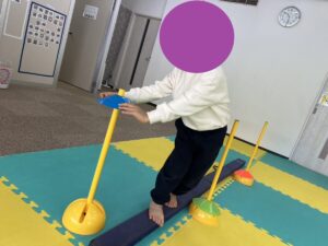 平均台カラーカップ通しでは下においてあるカラーカップを取っていれるので足の上下屈伸運動とバランスキープが重要です。