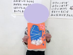 手袋の形に切られた画用紙の縁に穴があり、そこに毛糸を通してもらいました。