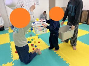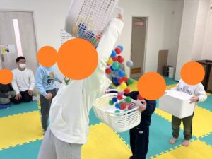 沢山のボールをカゴに入れ、前を向いたまま後ろのお友だちにカゴからカゴへボールを渡していく運動です。