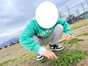 グラウンドでサッカーをしていたのですが、足元に生えているクローバーが気になったお友達。